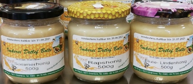 Am Sonnabend, d. 04. Oktober, ist unser Imker Detlef Bolte ab 7:30 Uhr bei uns im Dorfladen Gast. Er hat auf jeden Fall viele Sorten Honig zum Probieren dabei. Raps- und Lindenblüten-Honig gibt es zum Aktionspreis von 5,00 € pro 500g-Glas. Selbstverständlich kann man auch Honig-Likör und andere Artikel kosten und erwerben.