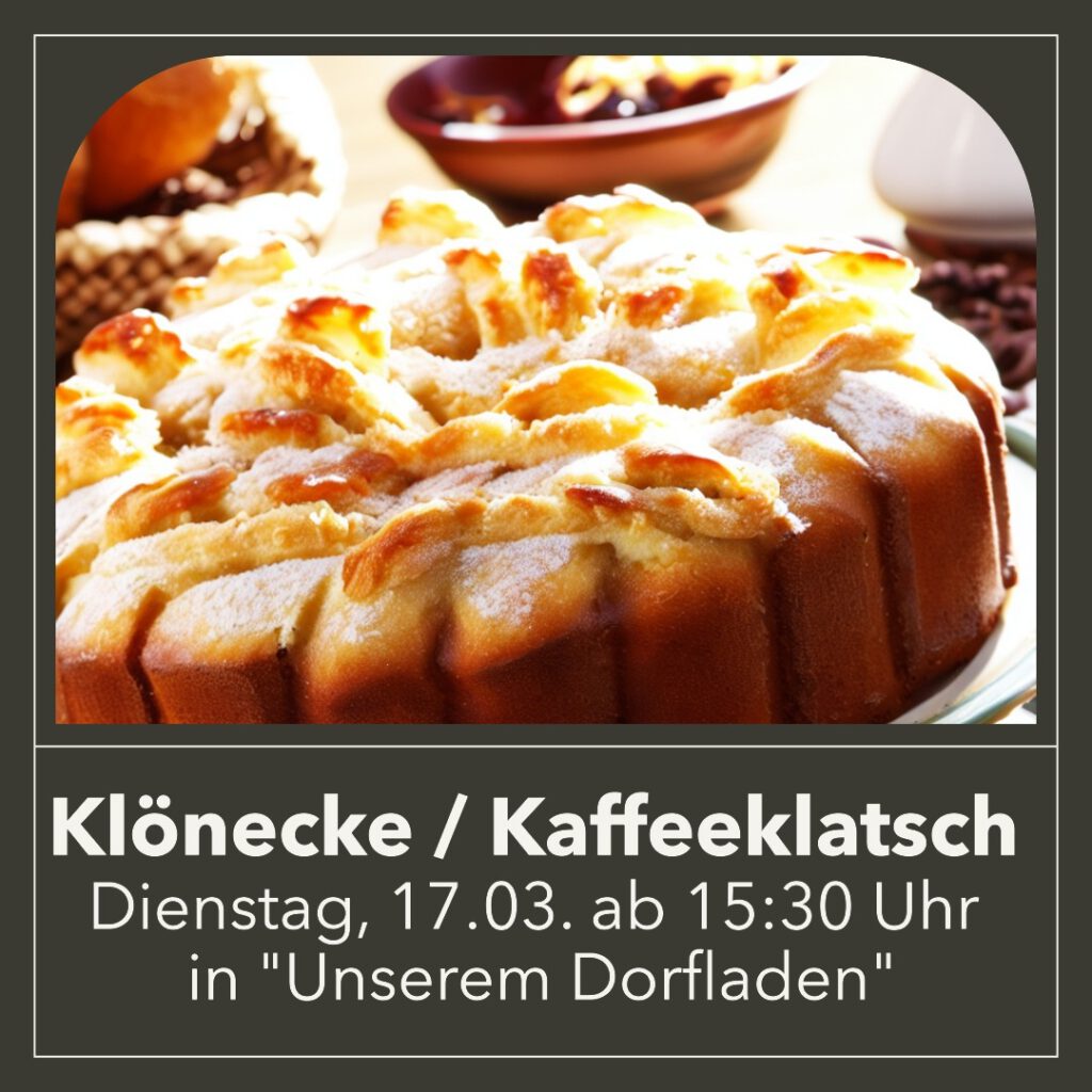 Die nächste Klönecke in Unserem Dorfladen Grambow findet am Dienstag, d. 17. März, ab 15:30 Uhr statt. Freuen Sie sich auf frischen Kuchen, Kaffee und nette Gäste. Ihr Team vom Dorfladen